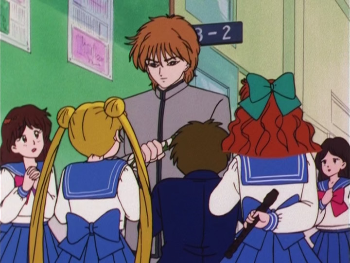 It's a new Moonlight Densetsu! Visually-wise anyway; we don't get the new audio for another year or so. This episode starts off a lot like the pilot, with Usagi (now a normal girl) having lost her memories and all her friends as a result of the wish she made at the end of last episode. She's late for school and is sent out into the corridor, much like the pilot episode. Ami is introduced immediately to symphasize with Usagi. But then... something crashes into Juban from space! It's a gross space seed! All five senshis somehow turn up at the crater... and Mamoru is there (and Usagi remembers him somehow?). We finally meet the new enemies, who are aliens, and they're talking about human energy! And they're attending Usagi's school! If only Jadeite wasn't locked in a crystal somewhere in the arctic; this seems like it would be right up his alley!